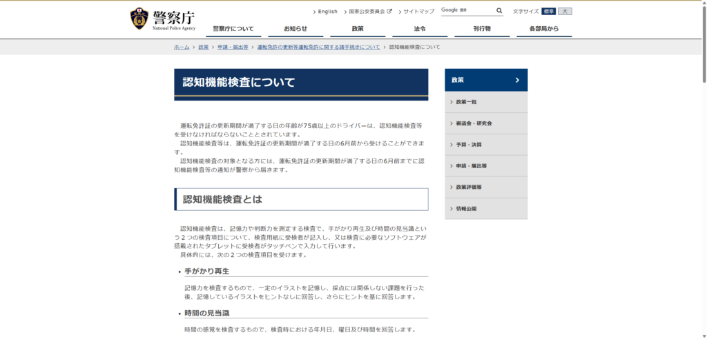 警視庁のホームページでは、認知機能検査についての説明が書いてあり、